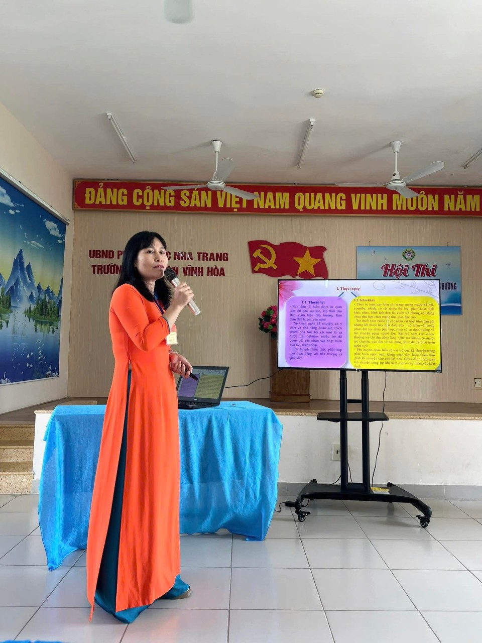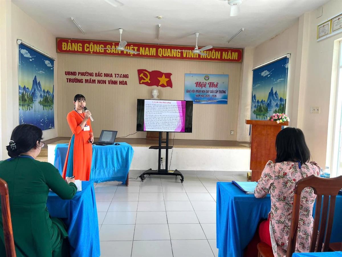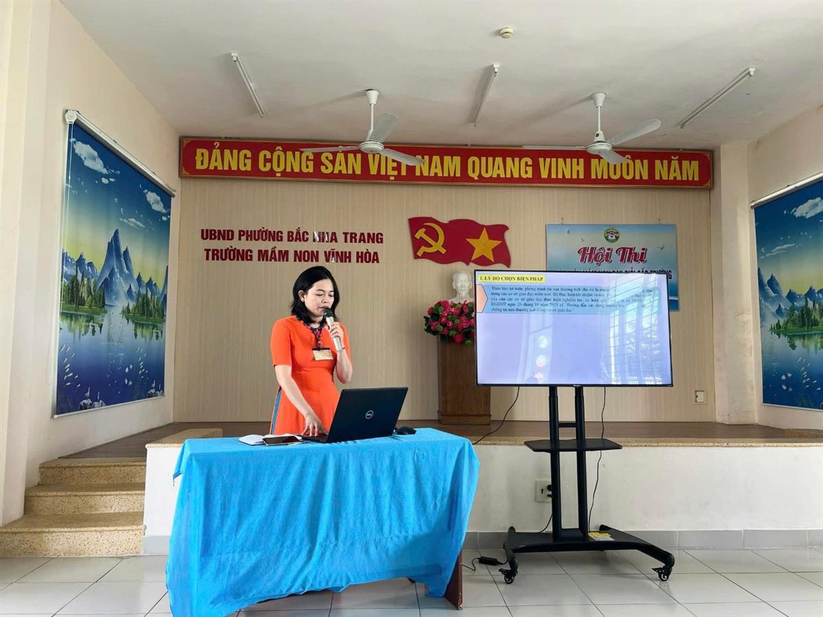 Giáo viên trình bày các giải pháp đổi mới, sáng tạo trong công tác chăm sóc – giáo dục trẻ, chia sẻ kinh nghiệm, sáng kiến, biện pháp hiệu quả được áp dụng trong thực tế. Phần thi này không chỉ thể hiện năng lực chuyên môn mà còn cho thấy tư duy sư phạm và khả năng tự học, tự bồi dưỡng của mỗi giáo viên.